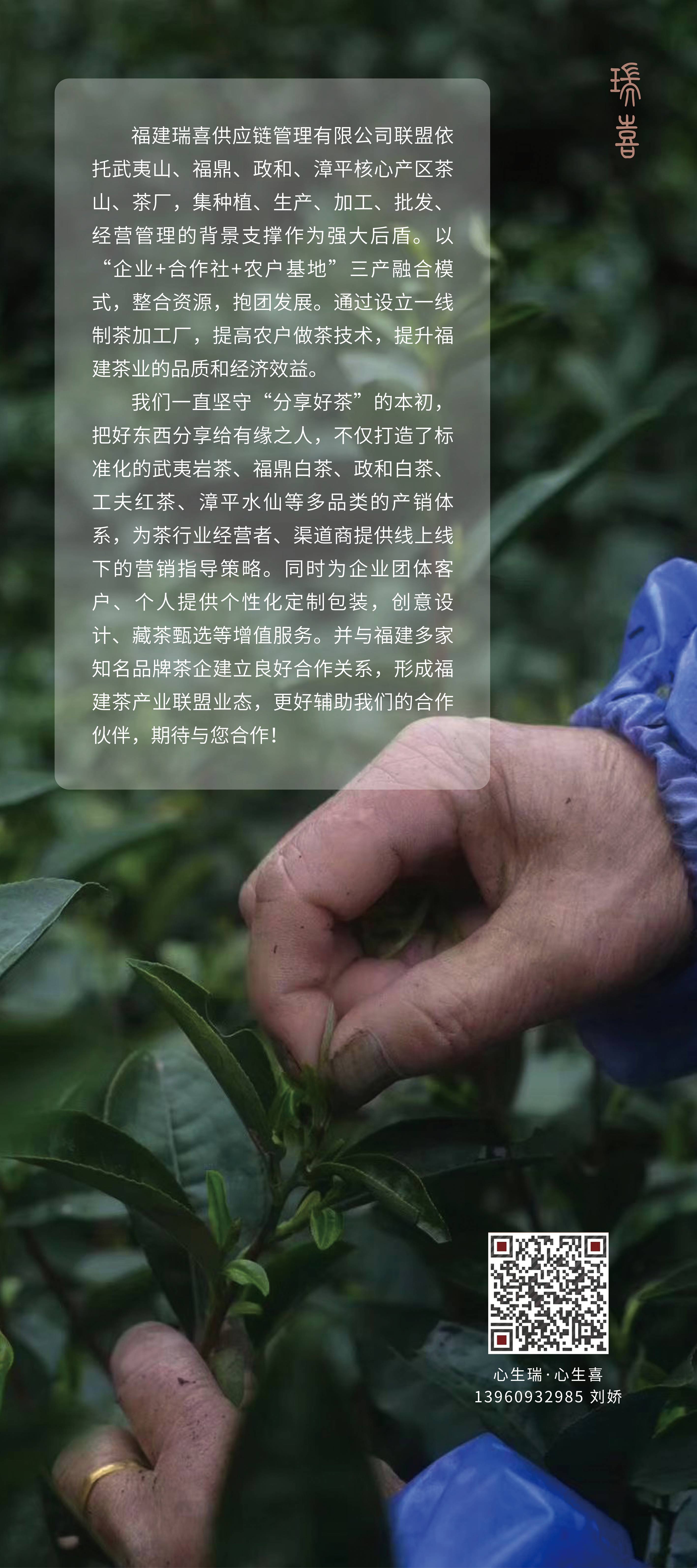 福建瑞喜供应链管理有限公司联盟依托武夷山、福鼎、政和、漳平核心产区茶山、茶厂,集种植、生产、加工、批发、经营管理的背景支撑作为强大后盾。以“企业+合作社+农户基地”三产融合模式,整合资源,抱团发展。通过设立一线制茶加工厂,提高农户做茶技术,提升福建茶业的品质和经济效益。
