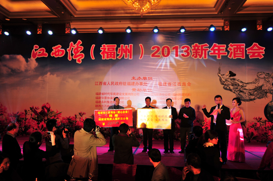 由江西省人民政府驻福建办事处和福建省江西商会联合主办的江西情(福州)2013新年酒会于2013年元月12日在福州香格里拉千人宴会厅隆重举行。本次酒会邀请了福建省主管领导和在闽省市级兄弟商会领导、各界友人等嘉宾80余人,江西籍在闽厅级干部60余人,处级干部600余人,江西籍在闽企业家450余人,共一千余人参加了盛会。 继前几年成功举办江西情酒会之后,酒会影响逐年扩大,参加酒会的嘉宾人数也逐年增多,今年的江西情(福州)2013新年酒会受到了各级领导的高度重视,原中共福建省委常委、福建省军区原司令员陈明端将军,福建省军区原副司令员朱光泉将军,福建省省委原副秘书长王国贤,原福州市委常委、福州军分区原政委王爱平,福建省经济社团联合会执行副会长夏玉瑚,江西省人民政府驻福建办事处黄明霞主任,福建省经协集团原董事长、党组书记方益全,福建省工商联副主席陈峰,福建省民间管理局局长汪洁生等领导,参加了本次酒会。 本次酒会把新年酒会和爱心助残有机结合,酒会上举行了别开生面的“奉献爱心,回报第二故乡”的爱心助残捐助仪式,