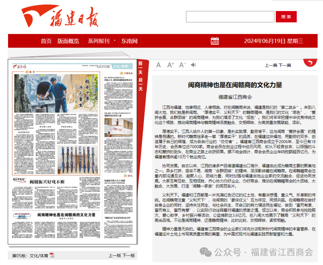 6月19日,《福建日报》首次刊登福建省江西商会文章《闽商精神也是在闽赣商的文化力量》。此举既是对福建省江西商会工作的鼓励,更是激励我会不断增强自身建设、提升服务水平,努力为闽赣两省经济高质量发展贡献新的力量。福建省江西商会成立于2006年,在闽耕耘18载,在“厚德实干,义利天下”的赣商精神影响下,在“爱拼会赢,合群团结”的闽商精神熏陶下,不断发展壮大,推动闽商精神与赣商精神深度融合、交相辉映,为高质量发展赋能、添彩。现将文章转发如下:闽商精神也是在闽赣商的文化力量江西与福建,地缘相近、人缘相亲。对在闽赣商来说,福建是我们的“第二故乡”。来到八闽大地,我们就是新闽商。“厚德实干,义利天下”的赣商精神,是我们的文化“底色”,“爱拼会赢,合群团结”的闽商精神,为我们增添了文化“成色”。我们将牢牢把握中华优秀传统文化这个根脉,推动闽商精神与赣商精神深度融合、交相辉映,为高质量发展赋能、添彩。厚德实干。江西人给外人的第一印象,是朴实敦厚、勤劳肯干,这与闽商“爱拼会赢”的精神是相通的。新时代赣商继承老一辈“厚德实干”的品质,在福建这块福地,用勤劳的双手,创造属于自己的辉煌,成为各自行业的“佼佼者”