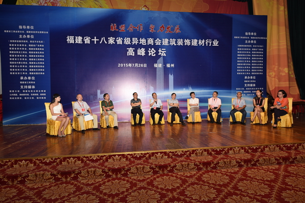 2015年7月26日,由福建省十八家省级异地商会联合主办,福建省江西商会承办的“联盟合作,聚力发展”福建省十八家省级异地商会建筑装饰建材行业高峰论坛在福州盛大开幕。福建省工商业联合会,福建省经济社团联合会领导,省内相关行业专家和来自安徽、广东、贵州、海南、黑龙江、湖北、湖南、吉林、江苏、江西、山东、山西、陕西、四川、天津、重庆十八省在闽商会200多位的商务精英齐聚一堂,就如何应对全球和国内经济现行形势对行业造成的影响;如何整合行业资源,凝聚力量,促进行业健康发展;如何建立商会联盟,联系合作,抱团发展等企业家关心的问题进行了讨论。福建省源森企业集团董事长张学霖、广州集泰化工有限公司(安泰福建分公司)董事长刘毅、紫龙玛钢实业有限公司董事长武卫斌、厦门艾拓瑞环保科技有限公司董事长李翠、厦门御全家居有限公司董事长、吴淑文、福州好日子装饰工程有限公司董事长王涌等成功企业家在论坛上分享了企业经验和行业思考沙龙环节,台上的领导嘉宾、行业专家热情讨论解答了企业家们关于总体经济形势恶化,行业恶意价格战情况普遍如何改变;传统行业如何升级;家族企业如何分配、管理人力资源,升级模式;企业众筹项目如何操作;小微