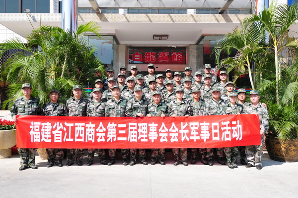 2013年10月26日福建省江西商会第三届理事会会长军事日活动在中国人民解放军驻榕某部隆重举行。下午2时,商会会长办公会成员一起来到中国人民解放军驻榕某部,参加会长军事日活动,会长们在部队领导的带领下参观了营区和食堂等生活设施,并参加了半自动步枪实弹射击体验,了解军旅生活,接受国防教育。
