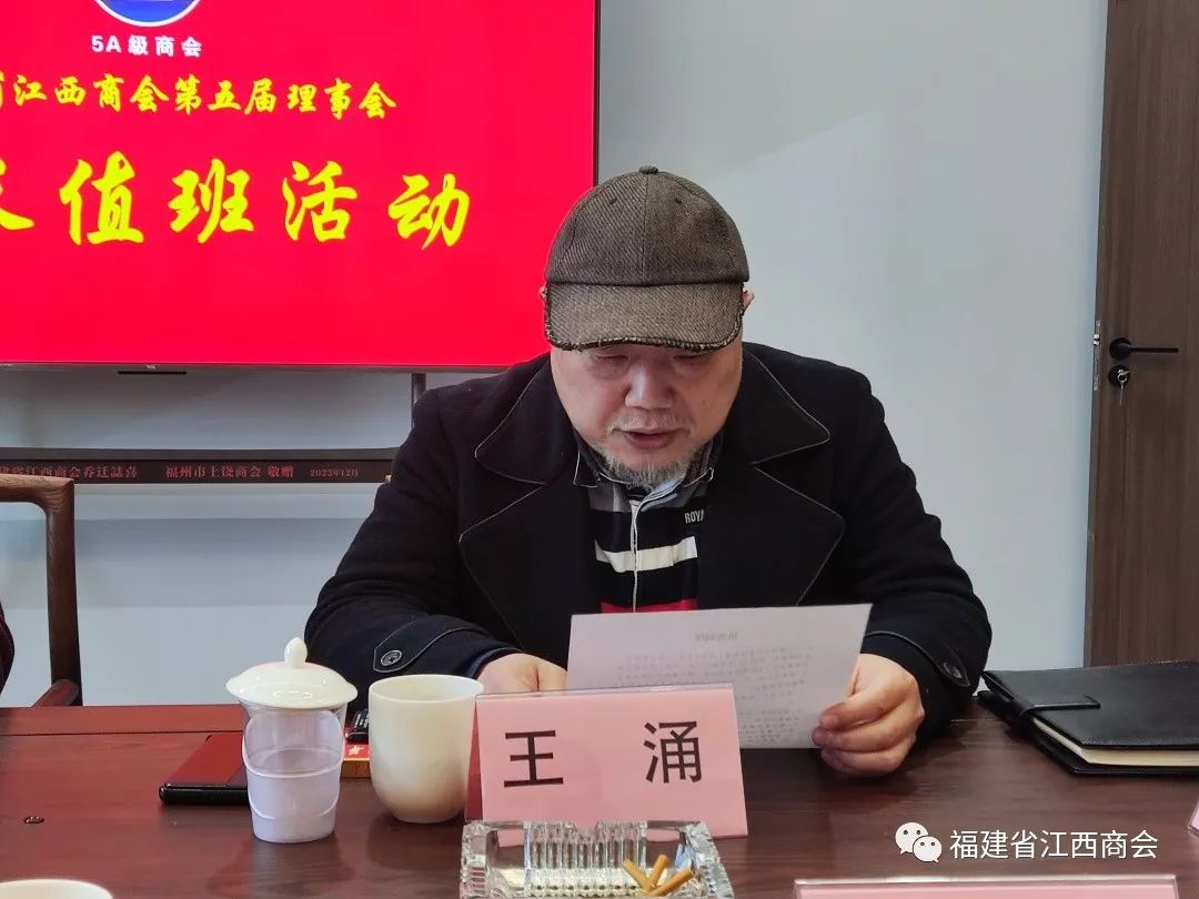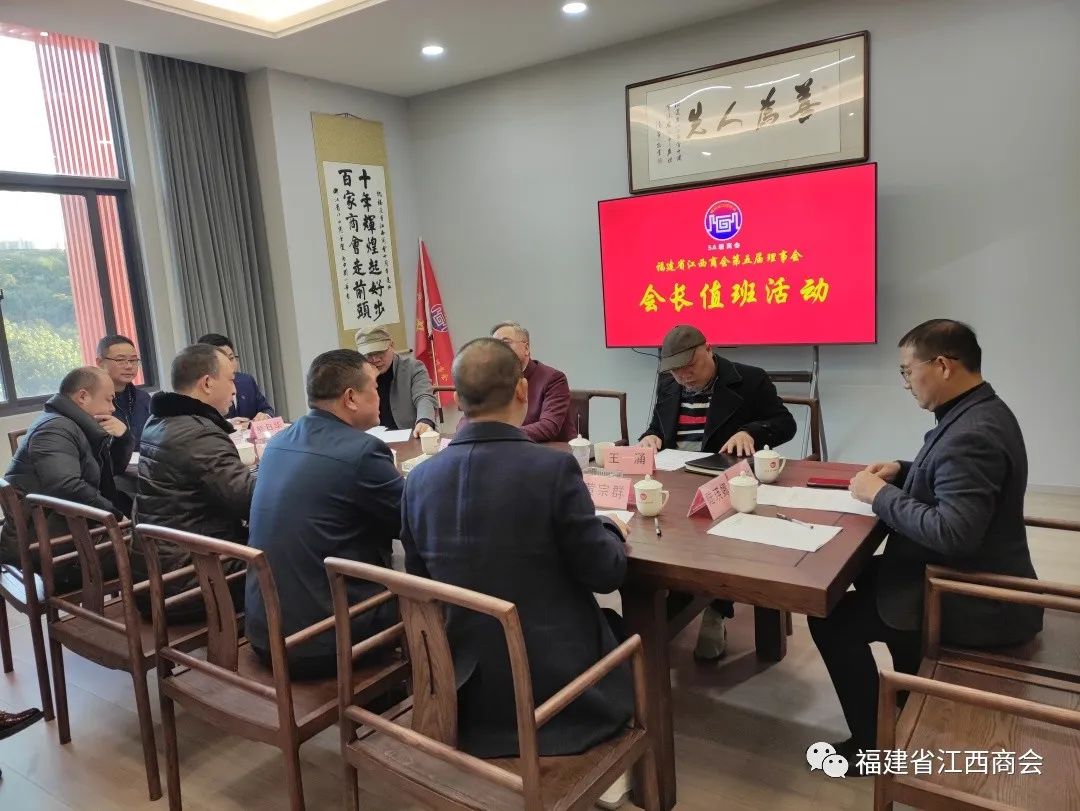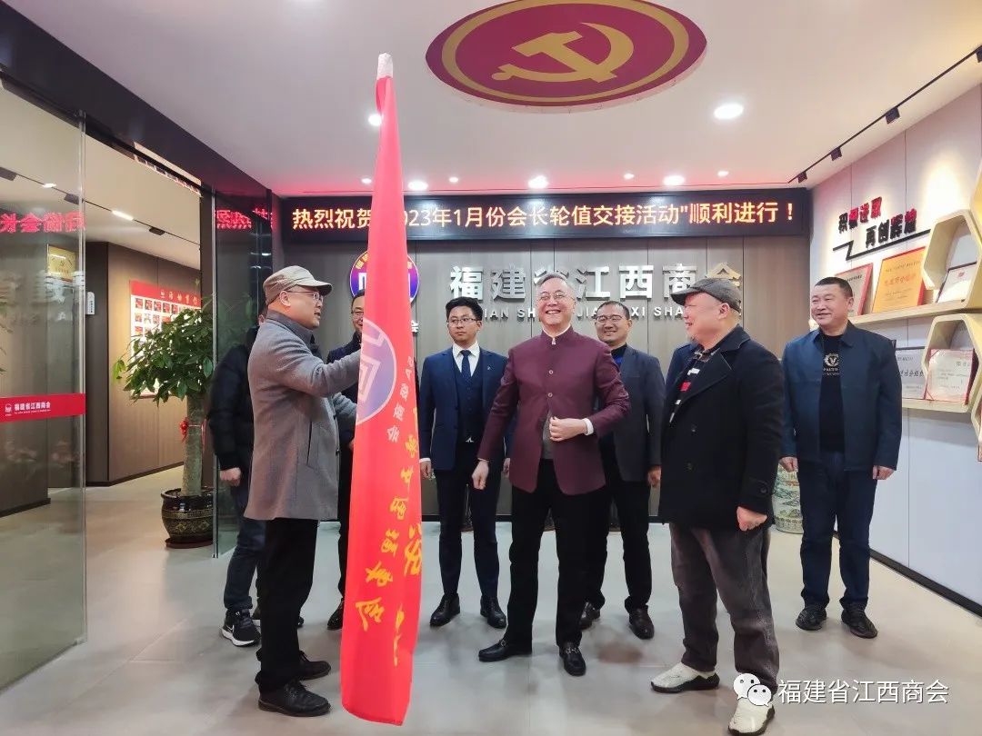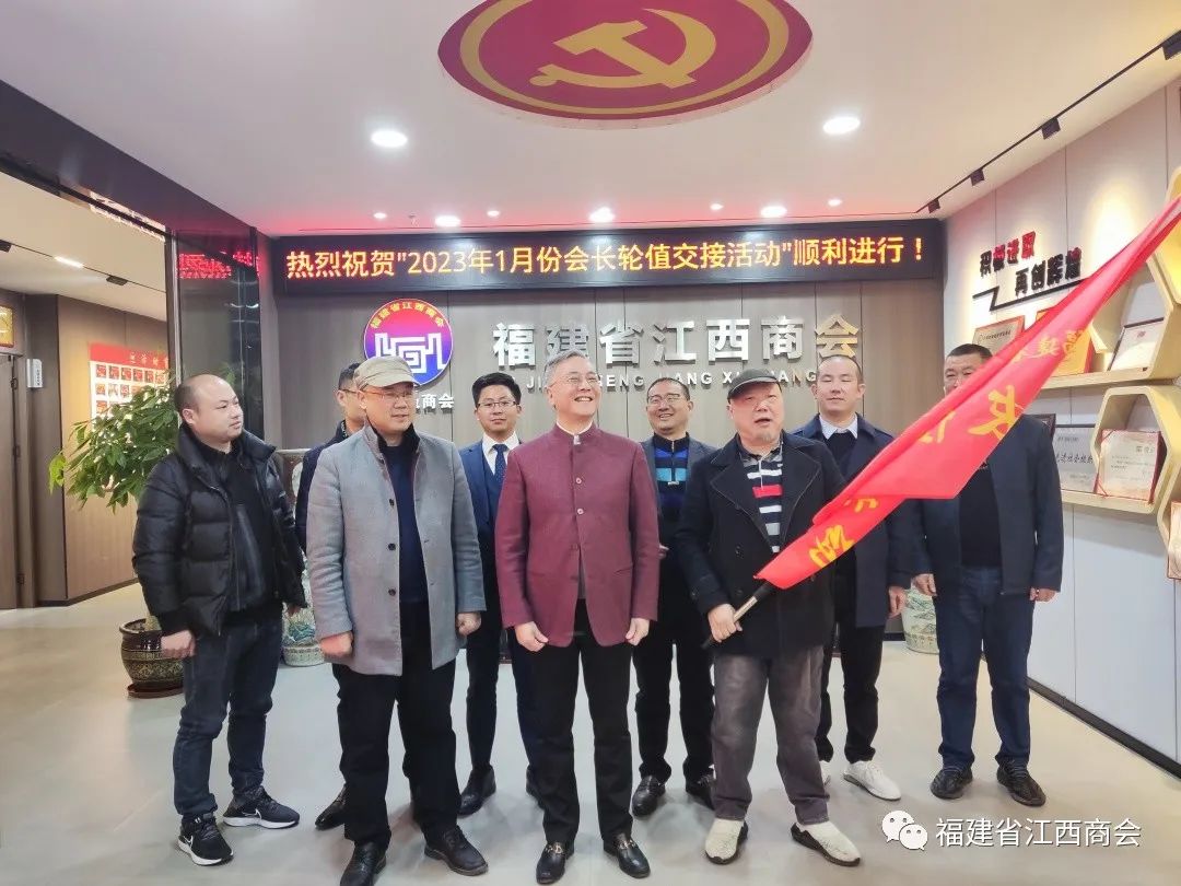 2023年1月30日下午,福建省江西商会在商会新会馆轮值会长室举行2023年1月份会长轮值活动交接仪式。会长张学霖,1月份轮值会长王涌、肖正钟、黄宗群,2月份轮值会长刘学军、熊日华、温集英、廖志平,秘书长周高福及秘书处工作人员出席本次活动。1月份轮值会长代表、常务副会长王涌主持本次活动。