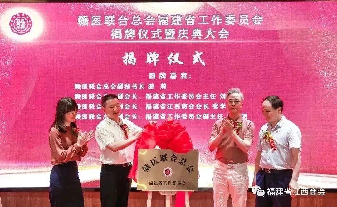 在全体参会人员的见证下,江西省赣医联合总会副秘书长游莉,赣医联合总会副会长、福建省江西商会会长张学霖,赣医联合总会副会长、福建省工作委员会主任刘振华,赣医联合总会副会长、福建省工作委员会副主任周朝明,共同为赣医联合总会福建省工作委员会揭牌,华丽开启福建省工作委员会新的篇章。
