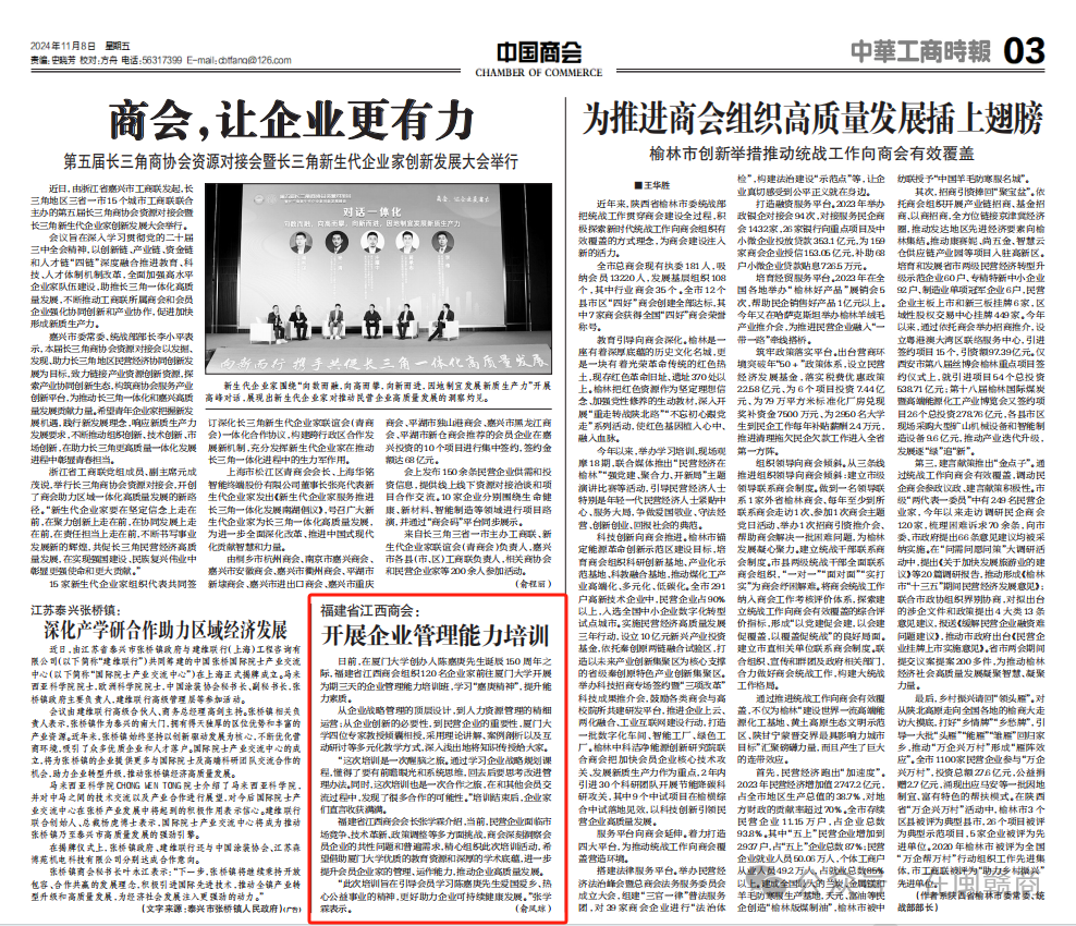 11月8日,中华工商时报第三版刊发福建省江西商会专题简讯——《开展企业管理能力培训》。文中,深入浅出地剖析了福建省江西商会组织商会120名会员赴厦大开展企业管理能力培训的意义与成效。现将全文转发如下: 开展企业管理能力培训 日前,在厦门大学创办人陈嘉庚先生诞辰150周年之际,福建省江西商会组织120名企业家前往厦门大学开展为期三天的企业管理能力培训班,学习“嘉庚精神”,提升能力素质。 从企业战略管理的顶层设计,到人力资源管理的精细运营;从企业创新的必要性,到民营企业的重要性,厦门大学四位专家教授倾囊相授,采用理论讲解、案例剖析以及互动研讨等多元化教学方式,深入浅出地将知识传授给大家。 “这次培训是一次醒脑之旅。通过学习企业战略规划课程,懂得了要有前瞻眼光和系统思维,回去后要思考改进管理办法。同时,这次培训也是一次合作之旅,在和其他会员交流过程中,发现了很多合作的可能性。”培训结束后,企业家们直言收获满满。 福建省江西商会会长张学霖介绍,当前,民营企业面临市场竞争、技术革新、政策调整等多方面挑战,商会深刻洞察会员企业的共性问题和普遍需求,精心组织此次培训活动,希望借助厦门大学优质的教育资源和深厚的学术底蕴,进一步提升会员企业家的管理、运作能力,推动企业高质量发展。 “此次培训旨在引导会员学习陈嘉庚先生爱国爱乡、热心公益事业的精神,更好助力企业可持续健康发展。”张学霖表示。