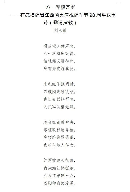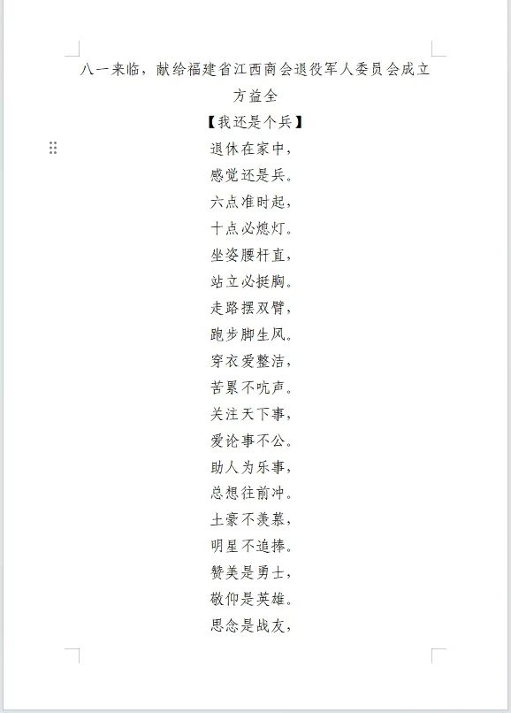 7月31日下午,福建省江西商会庆祝中国人民解放军建军 98 周年座谈会在商会会议室顺利召开。顾问委员会领导王爱平、罗春华、温佳禄、朱建平、刘长胜、江建雄、王石林、姚卫国、张伟、宋仟根、陈文汉、琚胜根、王一、张红翼,退役军人委员会顾问代表辛志华、皮华林,名誉会长刘群仙,党支部书记周高福,秘书长曹卫华,轮值会长张礼平、许建纲、程金庭,常务副会长朱振记,副会长何华旺、邓敏,以及曾经服役的理事、会员等三十余人参加会议。 座谈会由商会党支部书记周高福主持。 座谈会上,商会顾委会主任王爱平首先发言,他结合赣商群体与军人精神的深厚情结,提及商会退役军人委员会成立的意义,强调其对商会建设具有重要作用。并提出四点意见:一是重温军队光荣历史,汲取红色文化力量,为商会发展注入正能量;二是讲好江西“三个摇篮”故事,继承革命传统,提振商会精气神;三是借鉴军队建设经验,紧盯“文化商会、品牌商会、百年商会”目标,扎实推进工作;四是表达顾问委员会希望商会越办越好,朝着百年目标迈进的心愿,同时邀请领导对顾问委员会工作提建议。 值此建军98周年之际,现场进行了原创爱国拥军诗歌朗诵:顾委会副主任温佳禄代表顾委会副主任兼秘书长方益全朗诵《我还是个兵》,字字铿锵间尽显老兵对军营的赤诚眷恋与对责任的执着坚守。秘书长曹卫华代表原顾委会领导王国贤朗诵《赞战友情》,字里行间流淌着战友情深的滚烫温度与磅礴力量,生动彰显了人民军队血脉相连的强大凝聚力。顾委会张红翼被现场氛围深深触动,带来原创诗歌《曾经当过兵》,以真挚笔触回望军旅岁月,引发共鸣;此外,顾委会副主任刘长胜精心创作的《八一军旗万岁》,因座谈会时间关系未能现场宣读,但让在场者也感受到字里行间对军旗的深厚礼赞与赤子情怀。(以上诗词请在下图中滑动阅览) (图片可以左右滑动) (图片可以左右滑动) 轮值会长代表张礼平表示,商会成立退役军人委员会,旨在让商会退役军人找到“家”的归属感与温暖,重温军旅情怀、延续军人本色;同时搭建交流合作平台,推动退役军人企业互通有无、资源共享,助力企业做强做大,为江西乡亲增光、为军人荣誉添彩。他坚信,在各方支持下,委员会定能办出特色、富有成效。未来将常向各位首长汇报工作,全力把委员会办实办好,不辜负大家的信任与期盼。 座谈交流中,与会人员踊跃发言,分享对人民军队的深厚敬意与对历史的深刻感悟,围绕“传承军队精神、赋能商会发展”主题深入交流探讨,畅谈如何将军人作风融入商会日常工作与社会贡献实践中。现场氛围热烈融洽,思想碰撞间凝聚起共识,尽显赤诚与担当。 刘群仙名誉会长代表商会,对各位领导一直以来对商会的关心与厚爱表示感谢,强调正是这份支持让商会得以发展至今。他相信,在各位领导的持续关心和支持下,商会定能朝着“文化商会、品牌商会、百年商会”的目标不断迈进。同时,他提到虽然商会已有不少专委会,但他衷心希望退役军人委员会能充分发扬解放军的光荣传统,并将其运用到企业经营发展中,若能学好、用好这些优良传统,企业和商会都会发展得更好。 周高福书记在总结时表示,本次座谈会严肃活泼、形式多样、有主题发言、有朗诵,共同回望人民军队98年光辉历程,进一步坚定了传承弘扬军队优良传统的决心。商会退役军人将以此次活动为契机,把感悟转化为行动,在岗位上拼搏奉献,为商会蓬勃发展及国家繁荣富强贡献力量。 最后,全体参会人员共同合影留念,将这份相聚的热忱与共识定格成珍贵瞬间,为此次座谈会画上了圆满句号。