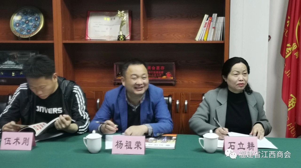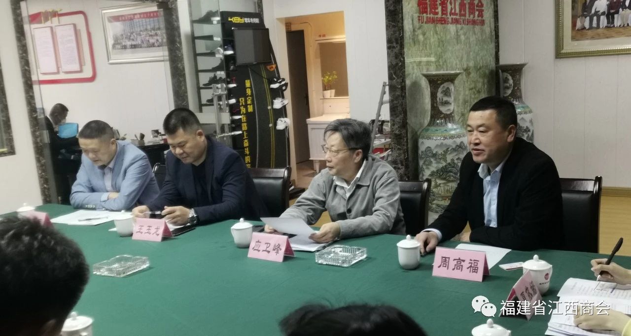 2020年4月23日上午,江西共青城市委常委,组织部长杨祖荣一行8人,来我会考察座谈,参加座谈会人员有:共青城市委常委、组织部部长杨祖荣、市政府党组成员石立耕、市苏家垱乡党委书记伍术刚、市民政局局长张方元、市财政局总部经济办主任孙冰瑶、市委组织部办公室主任张业成、市苏家垱乡招商办主任夏依娜、市民政局社会组织科主任王亮,福建省江西商会监事长、福建承创堂中药有限公司董事长应卫峰、福建省江西九江商会会长、福建裕轩投资有限公司董事长王玉龙、福建省江西商会秘书长周高福、会员、福建国亚汽车服务有限公司董事长徐朝晖、秘书处秘书周卫华、吴贵兰。首先,杨祖荣部长和周高福秘书长分别介绍了参加座谈会共青城和商会的代表。